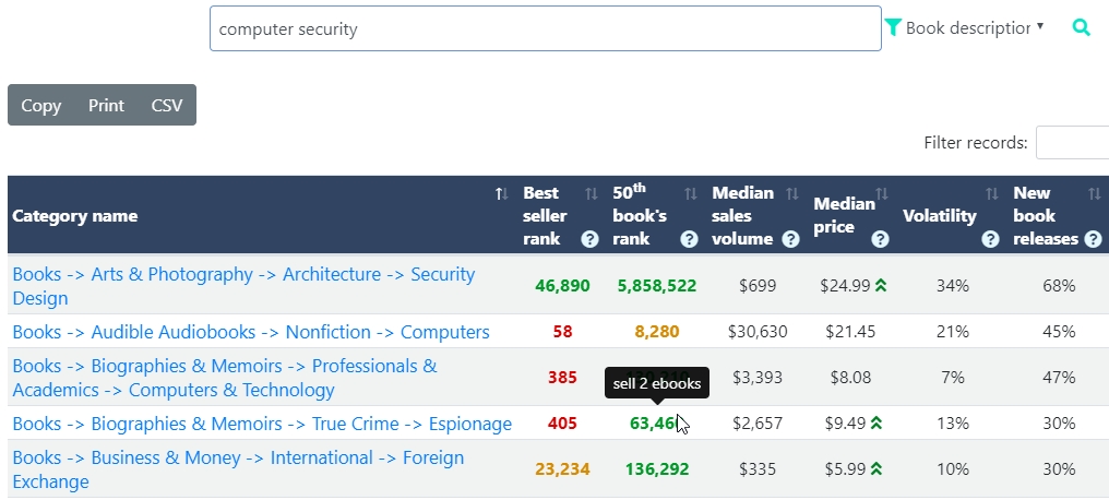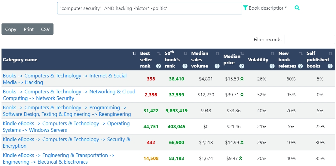 Instead of searching for obvious keywords in Amazon book category names, we will look for titles or descriptions related to computer security best seller books. Kindle Ranker will show us which Amazon book category names they are featured in.