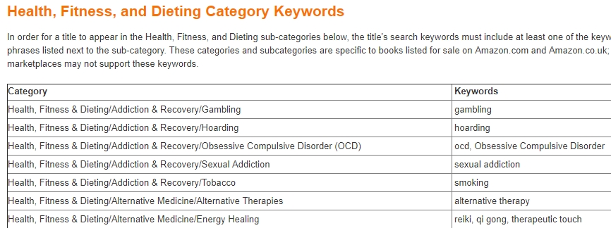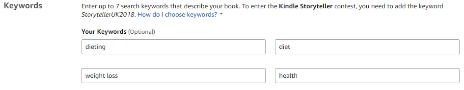 You get to register your “search keywords” on the KDP publishing platform in the Book’s detail section. Maybe you think of putting something like this (assuming you publish a book about health and dieting):